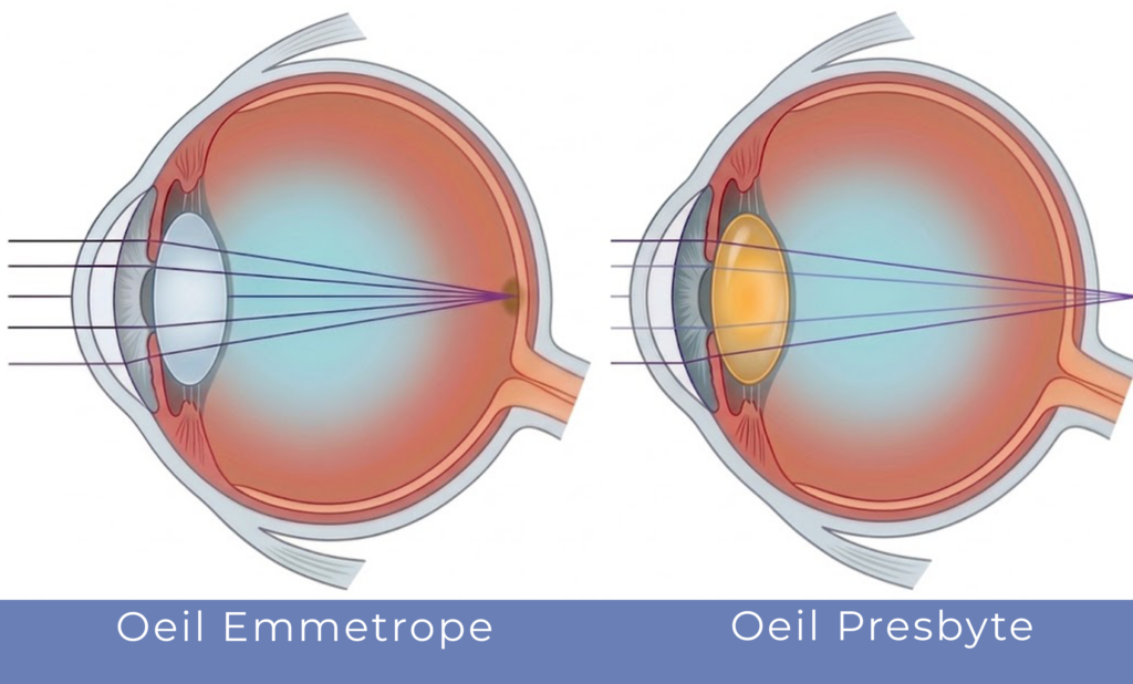 La presbytie résulte du vieillissement naturel du cristallin et de la diminution de son élasticité.